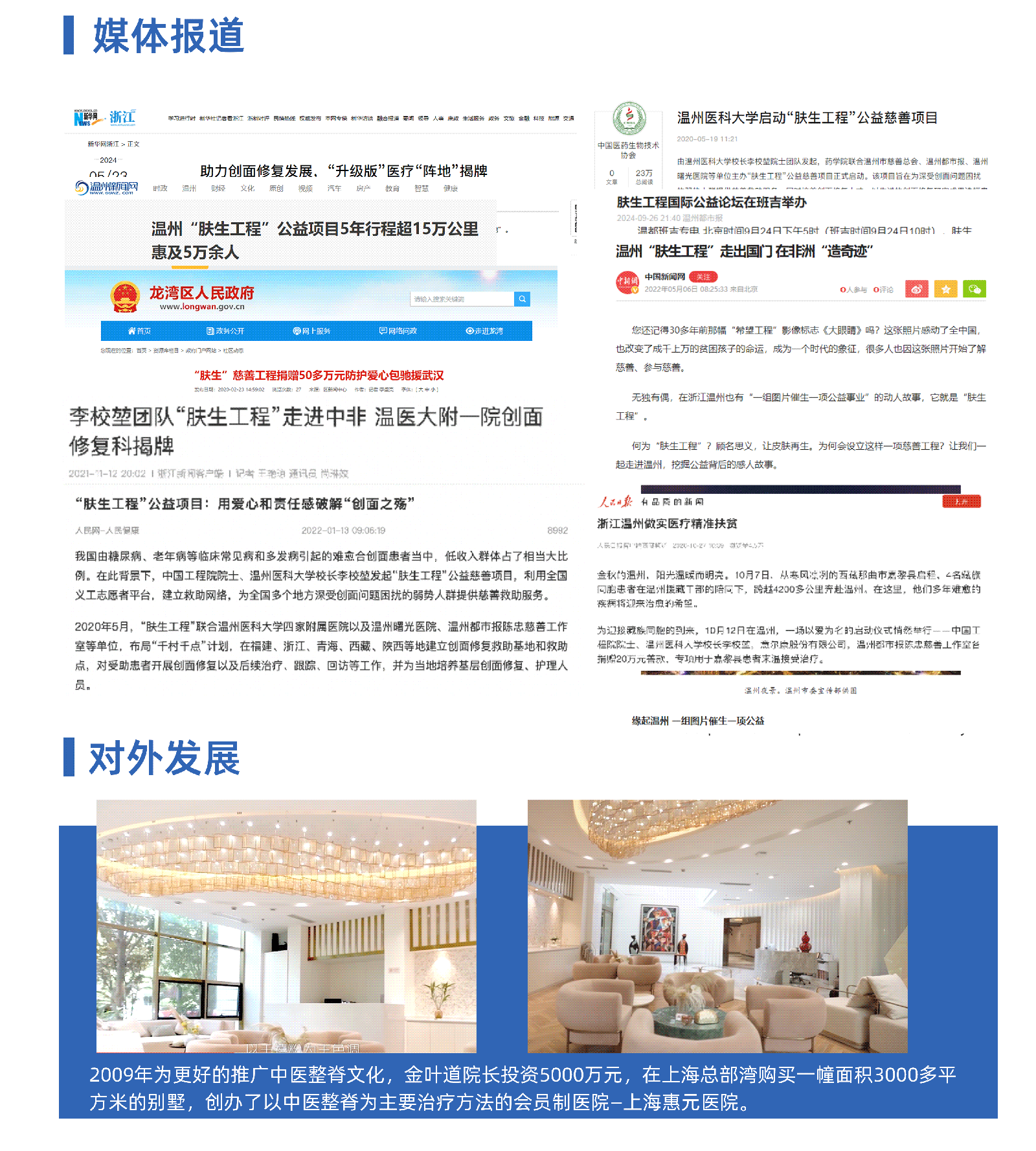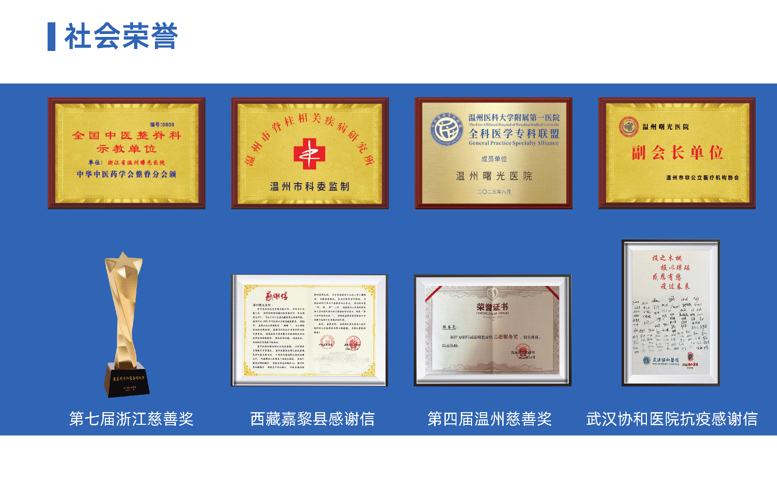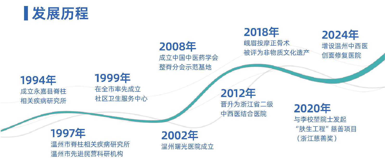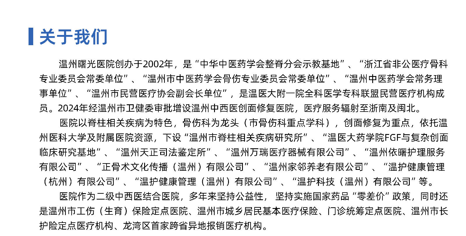 温州曙光医院创办于2002年,是“中华中医药学会整脊分会示教基地”“浙江省非公医疗骨科专业委员会常委单位”“温州市中医药学会骨伤专业委员会常委单位”“温州中医药学会常务理事单位”“温州市民营医疗协会副会长单位”,是温医大附一院全科医学专科联盟首个民营医疗机构成员。2024年经温州市卫健委审批增设温州中西医创面修复医院,是全国首个创面修复专科医院,医疗服务已辐射至浙南及闽北。